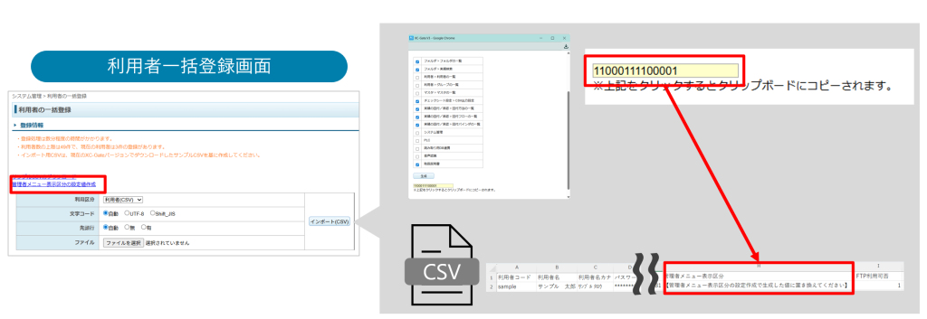 CSVファイルから利用者情報を登録できる、利用者一括登録機能の場合でも、ユーザーごとの管理者画面メニュー表示項目を設定することができます。一括登録画面にて設定値を生成することができるため、生成した値(0と1で構成された値)をCSVファイルに貼付し、利用者情報をインポートしてください。