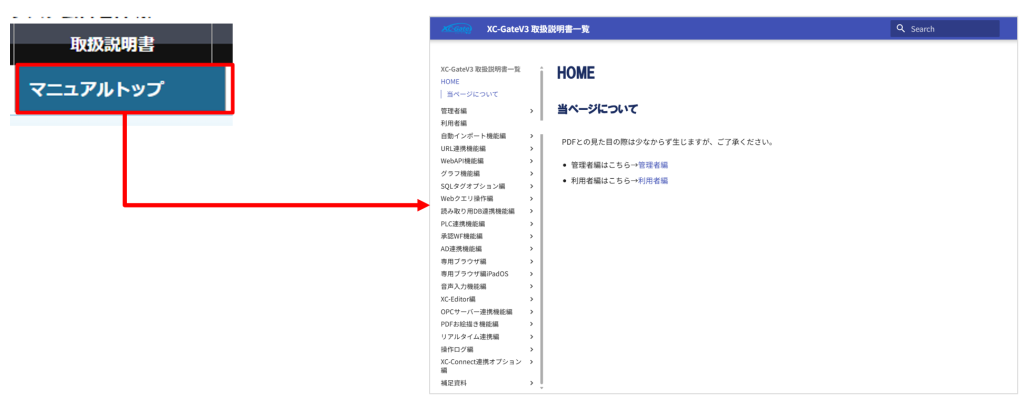 管理者画面に取扱説明書メニューが追加され、WEBブラウザ上でXC-Gate.V3の取扱説明書を閲覧できるようになりました。ご購入いただいたオプション機能の取扱説明書もすべてWEBブラウザ上で閲覧・キーワード検索ができるようになります。