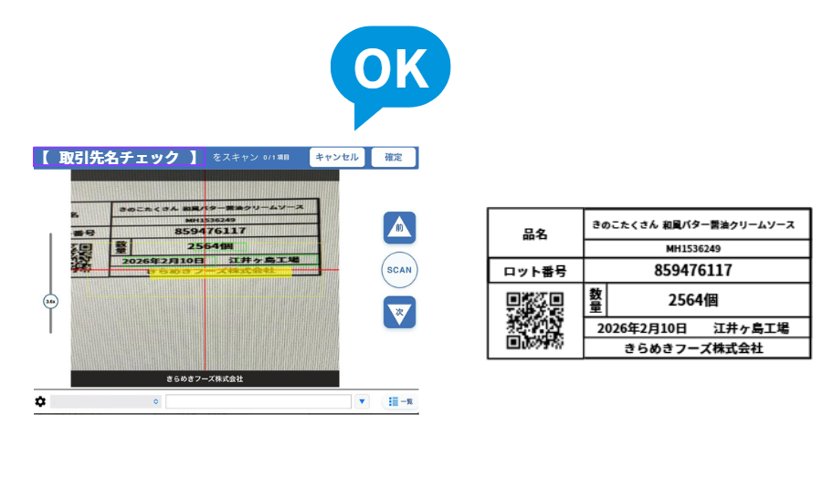 取引先名や製造番号、賞味期限など、コードで表現されていない情報をAI-OCR機能で読み取り、問題がないかのチェックを電子帳票上で行うことで、ヒューマンエラー対策につながります。