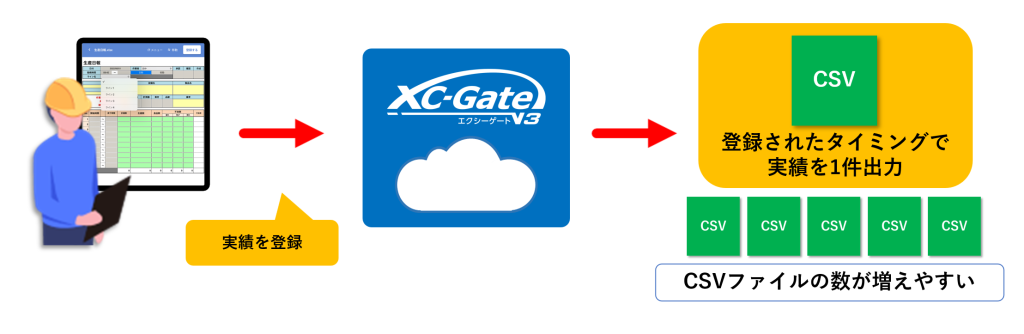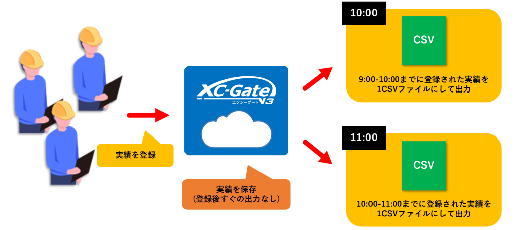 XC-Gateに実装されている実績の自動出力機能では、現場で入力された実績がXC-Gateのサーバーに登録されたタイミングで、予め指定したフォルダに実績をCSVまたはExcel形式で1件出力できます。Excelで実績を出力する場合は、件数ごとにあらかじめレイアウトされた帳票フォームで出力されるため、1件ずつの実績出力でも不都合を感じることはあまりありませんでしたが、CSV出力については入力結果をデータの項目別に出力するため、実績が登録されるたびに1件ずつCSVファイルが出力されるとファイル管理が行いづらいというご意見をいただくことがありました。