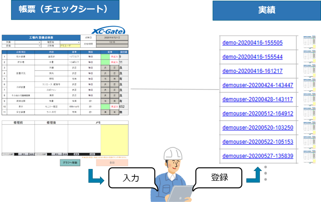 また、帳票に入力し、XC-Gateサーバーへ保存した個々の作業記録を「実績」と呼んでいます。
