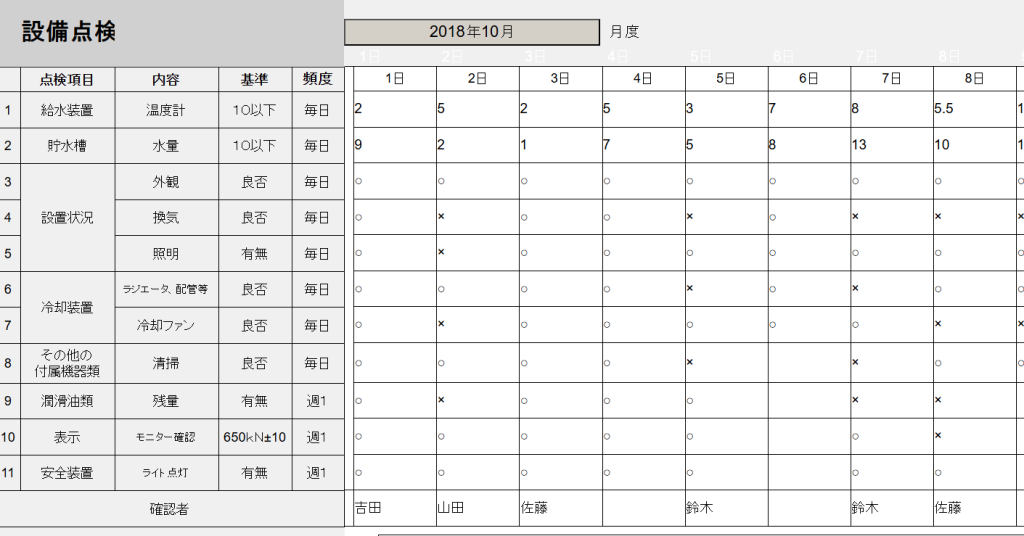 点検日報での実績で、作業日が2018年10月中のデータを一覧表示しています↓