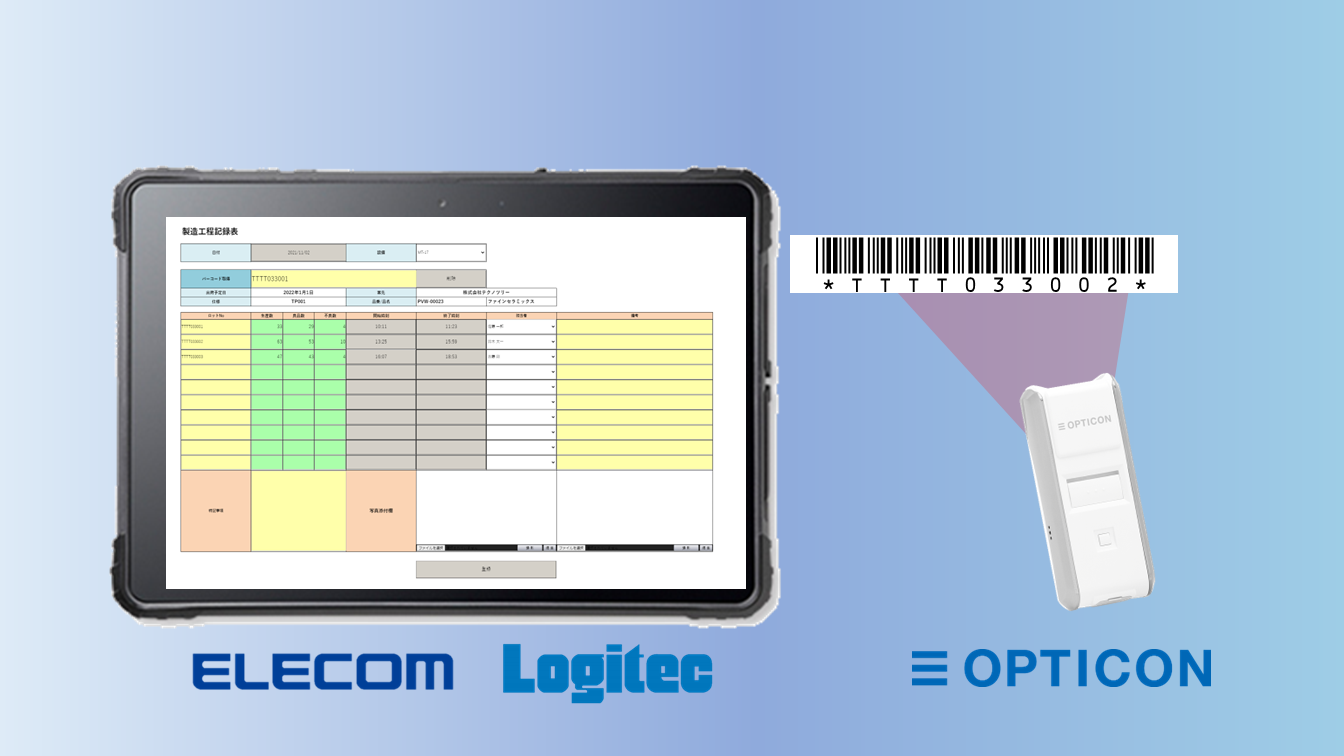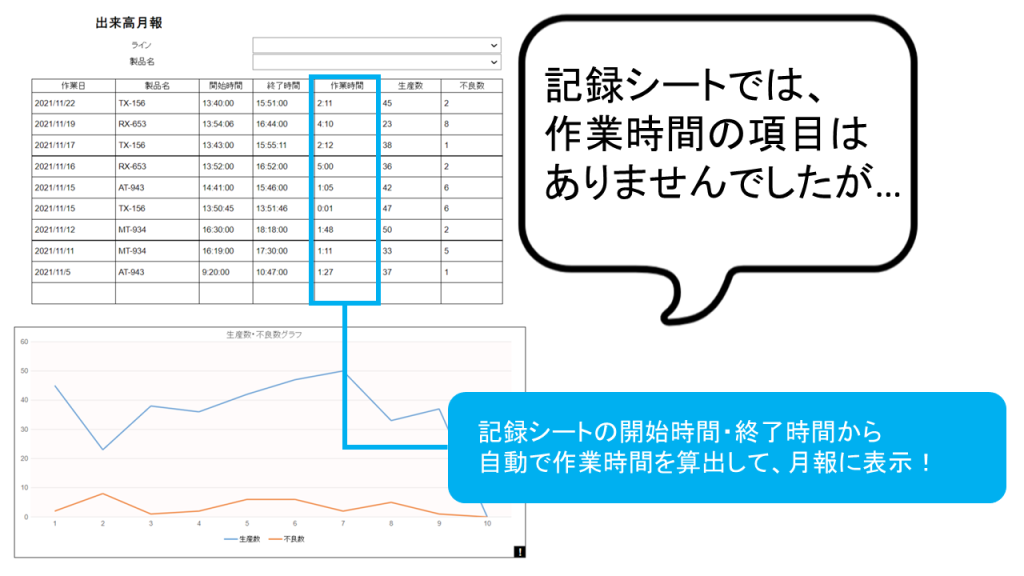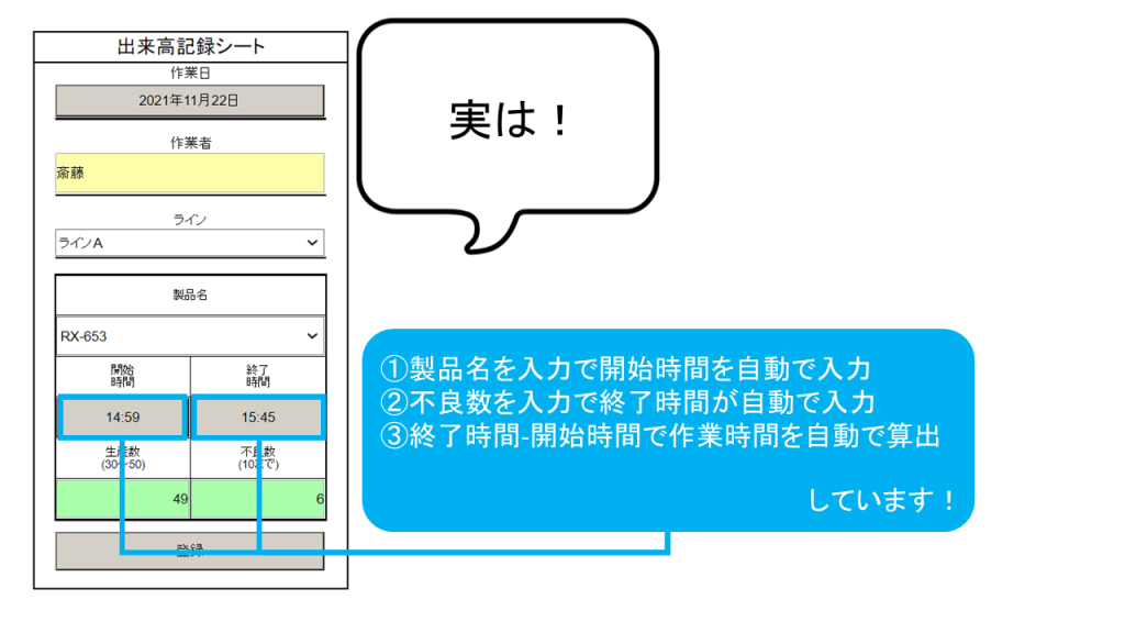 製品名を選択・入力すると作業開始時間に自動的に時刻が入力され、最後の項目の不良数を入力すると作業終了時間も自動的に時刻が入力されるようになっており、正確な作業時間を収集できます。また、作業者の方がわざわざ時刻を入力するという手間も減らせます。