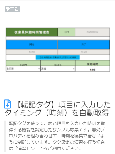 このような、なにか入力されたタイミングで時間を自動取得する、という機能は、*転記タグをExcel帳票内に設定して、実現させています。