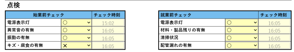 こちらは始業前点検記録の例ですが、ただ○×を入れるだけでは紙帳票と収集できる情報は変わりませんので、1つ1つのチェック項目に入力されたタイミングの時間を取得する機能を設定しています。
