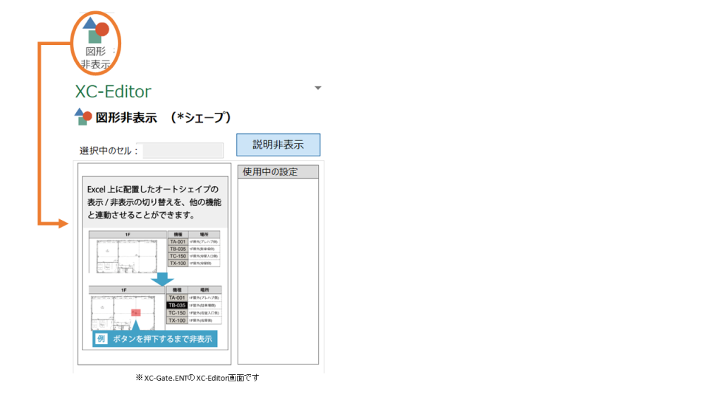 表示・非表示を切り替えたいオートシェイプを選択したまま、XC-Editorの機能アイコンの中にある、「図形非表示」を選択して設定してください。