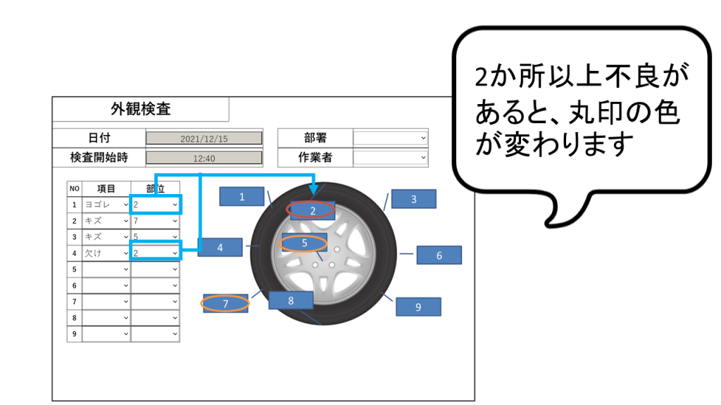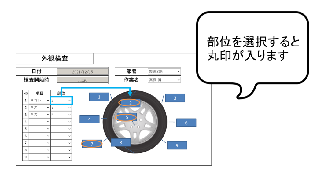 部位を選択すると、その番号に丸印が表示され、どの部分に対して不良が記録されているのかが一目でわかるようになっています。
