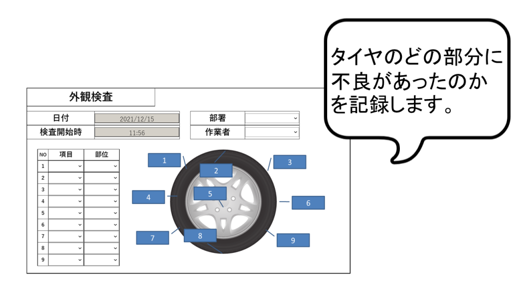 製品の外観・目視検査などで不具合があった箇所を記録する必要がある運用に最適です。本記事では、タイヤの外観検査を例にご紹介いたします。