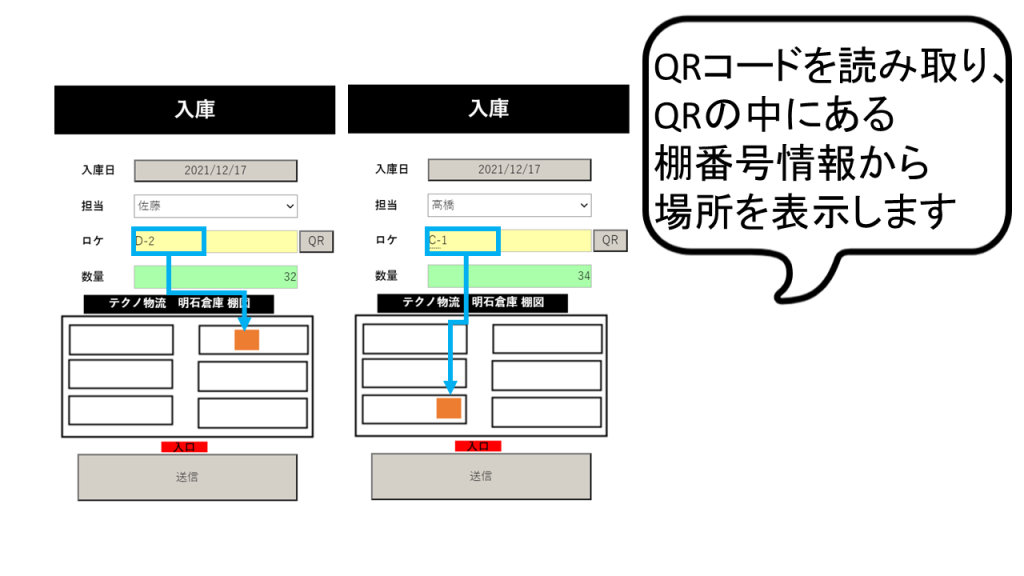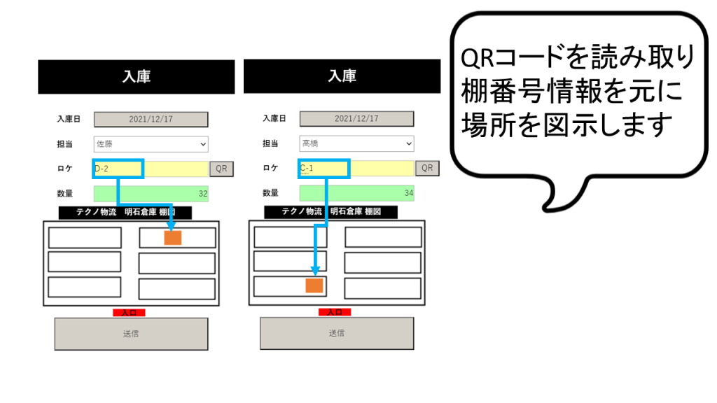 倉庫内の商品の入庫作業で、商品についているQRコードを読み取るとその情報に合った棚番号が自動的に表示されます。