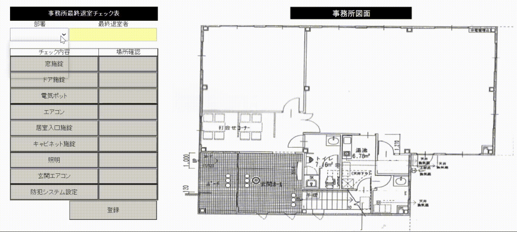 右側のボタンを押すと、上の図の通り図面上にオートシェイプが表示されます。初めてチェック作業を行う人でも、施設内のどの場所を確認したらよいかを電子帳票上で確認することができ、別の方に聞かなくても正確にチェックを実施できます。