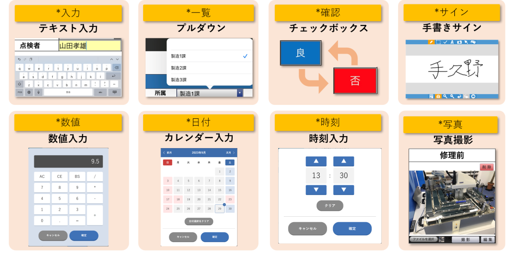 | 文字・数値入力 | プルダウン | ページ移動 | ボタン入力 | 写真貼り付け |
