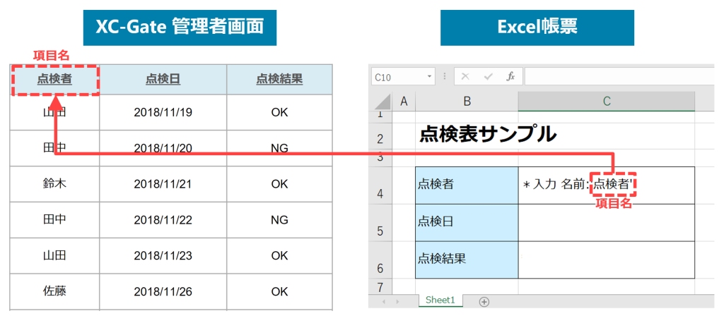 XC-Gateは、Excelで電子帳票を作成することができますが、そのWEB帳票へ文字入力やボタン選択、写真撮影など様々な入力機能を設定するには、Excelのセル内にXC-Gateの「タグ」を記述する必要があります。
