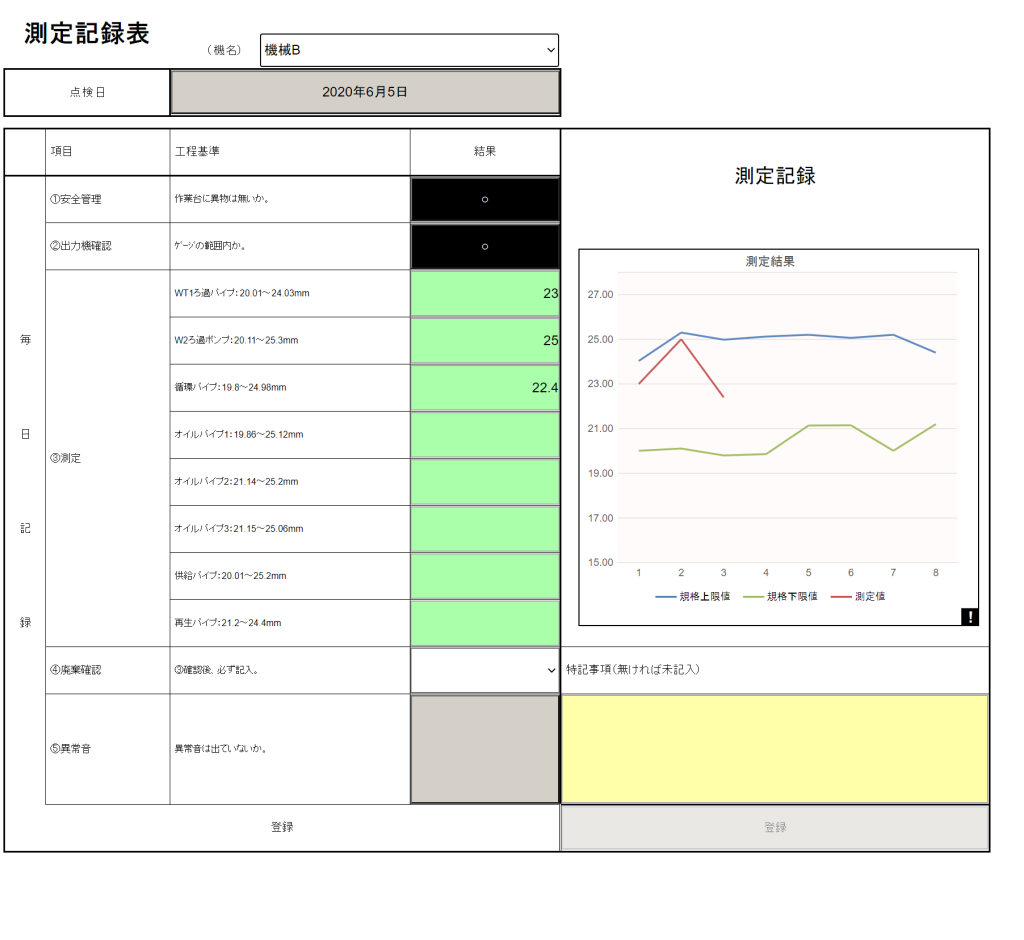 多くの種類の機器がある為に、設備点検項目も多い。設備の予兆管理が重要な為に、設備点検終了後には点検データをExcelで集計表作成、別途グラフ化して設備の状況チェックしているが、点検現場でこのような確認を行いたい。