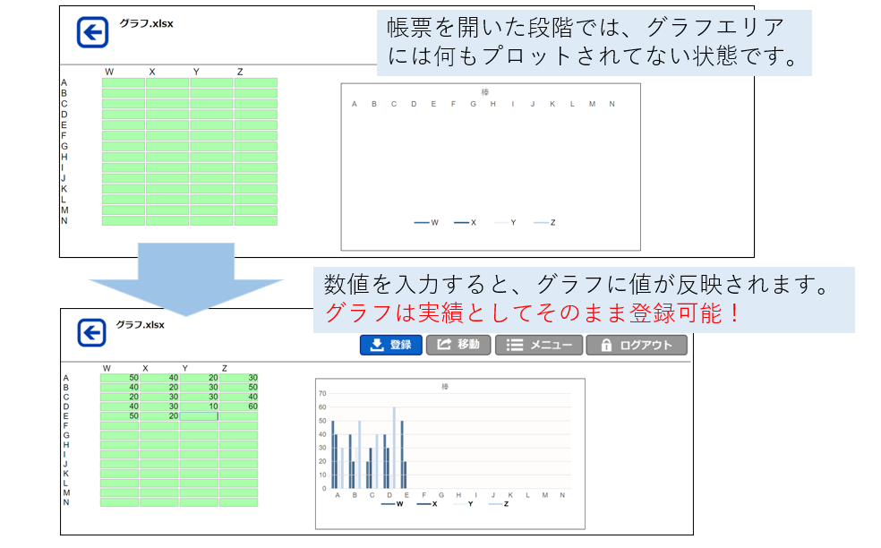 数値入力欄など、データが表示されている範囲を指定してグラフを作成し、XC-Gateに登録するだけ!Excelのグラフ機能で生成したグラフを、XC-Gateの画面(タブレット・PC)で表示できます。