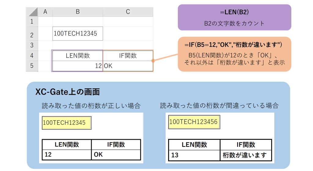 LEN関数と組み合わせ、選んだセルの文字数に応じてフラグを分けることができます。