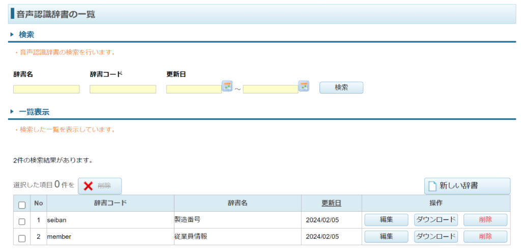 数値や日付入力は標準で対応しておりますが、製品番号や従業員情報などのお客様ごとに異なる単語については、音声辞書として登録しておく必要があります。音声辞書は、「XC-Gate.V3」の管理者画面から直接入力、もしくはCSVファイルで用意して管理者画面からインポートすることで、簡単に登録することができます。