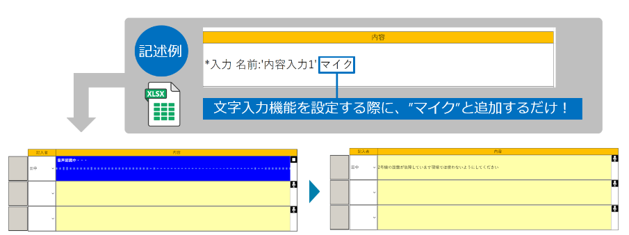 文字入力機能(*入力タグ)に、音声によるテキスト自由入力機能が追加されました。Excelで、通常の文字入力機能を設定する際にカタカナで”マイク”と追加するだけで設定ができます。製品内では「マイクプロパティ」と表記しております。