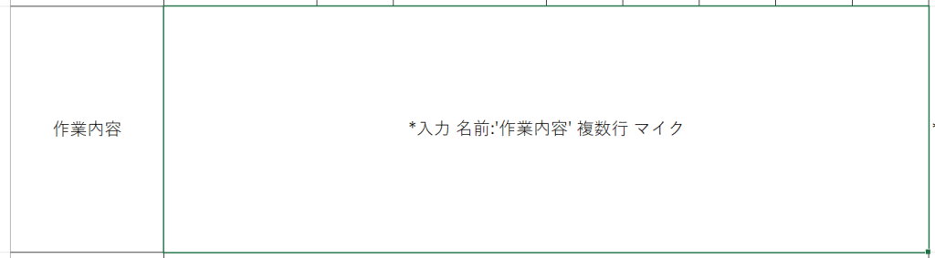 「XC-Gate」はExcelだけで電子帳票を作成できるので、音声入力機能もExcel帳票内で設定します。Excel帳票を開いて、音声で入力したい箇所(セル)に文字入力機能(*入力タグ)を設定します。そこに、「マイク」と追記するだけで設定できます。