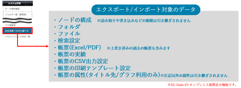 「システム管理※」に「エクスポート/インポート」を追加しました。XC-Gateのデータでエクスポート/インポート可能な情報は以下の通りです。※XC-Gate.V3 オンプレミス版のみの機能追加です