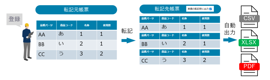実績の転記機能で転記元帳票の実績登録時に、転記先帳票の実績データをCSV/Excel/PDF形式で自動出力できるように機能改善を行いました。