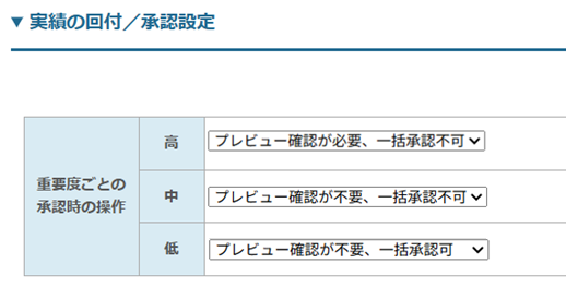 重要度は、承認ルールを設定する回付フローで設定します。高・中・低の重要度に合わせて、一括承認だけではなく、実績をプレビュー画面で確認しないと承認ができないようにするといった、承認作業の制御機能も追加いたしました。重要度別に「プレビュー確認が必要か不要か」「一括承認が可能か不可能か」を設定することが可能ですので、社内の承認・運用ルールに合わせてご設定ください。(重要度ごとの承認時の操作設定はシステム管理画面※から行えます)