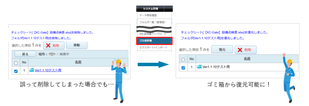 「システム管理※」に「ゴミ箱管理」を追加しました。削除したデータが一時的に保管されるため、誤って削除した時も復元ができるようになります。