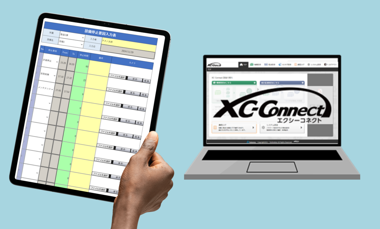 稼働データを「XC-Gate」の帳票に取り込むことで、停止発生時刻と理由がリアルタイムで連動します。現場担当者は停止理由や対応内容の「補足情報」だけを入力すればよいので、作業負担を減らしながら正確なデータを残すことが可能になります。