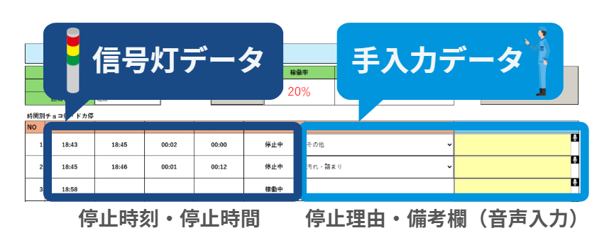 「シグナルウォッチャー」は、この信号灯情報を取得し、設備稼働データとして蓄積できるソリューションです。しかし、稼働状況を正しく可視化するためには、この信号情報だけでなく、「なぜ止まったのか」「どのような対応を行ったのか」といった現場の状況もあわせて記録することが重要です。