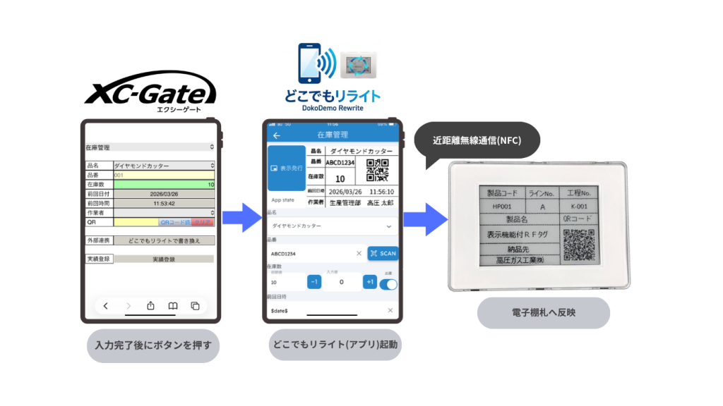 「入力(XC-Gate)→ アプリ連携 → NFC → 電子棚札(ディスプレイタグ)表示」