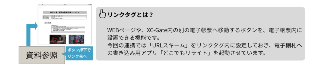 その後、帳票上に設置されたボタン(リンクタグ)を押下することで、スマートフォンにインストールされた専用アプリ「どこでもリライト」が起動します。