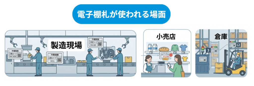 また、小売店での価格表示や商品情報の掲示など、身近な場面でも活用が進んでいます。リアルタイム更新と繰り返し利用が可能なため、ペーパーレス化と効率的な情報共有を実現できます。