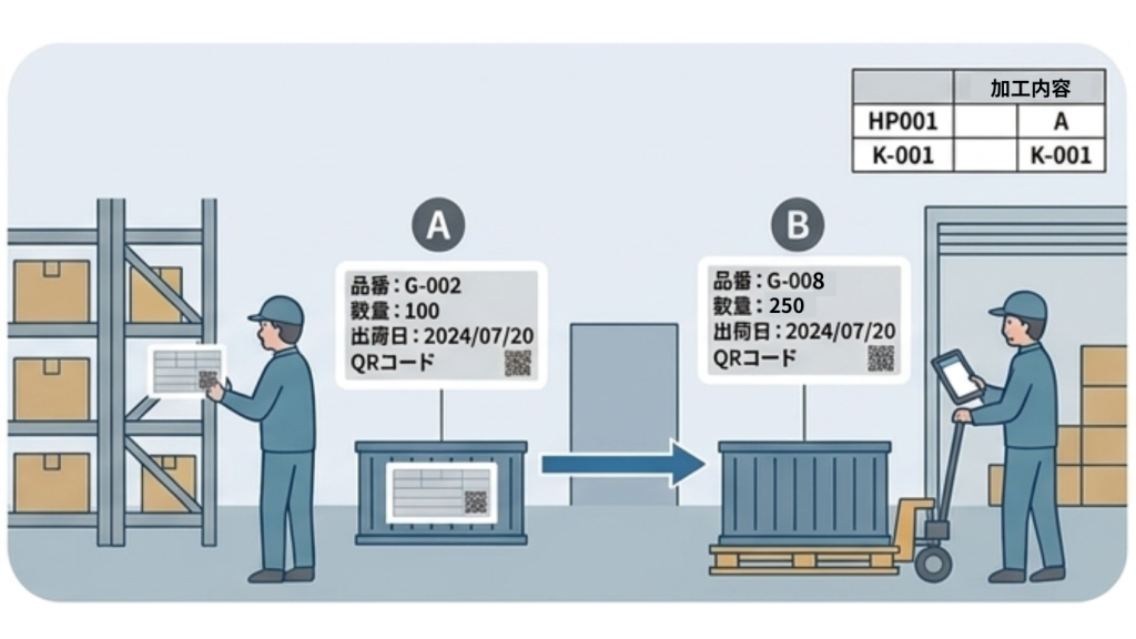 品番や数量、出荷日といった情報を表示し、工程間の移動に応じて内容を書き換える運用が可能です。