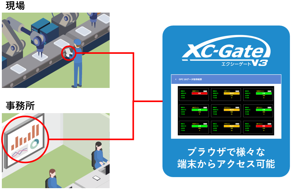 XC-Gate.V3ではOPCサーバーを介して様々な制御機器からの情報を取得することにより、生産設備の稼働進捗をモニター表示したり、生産実績のデータを取得するなど、現場の稼働状況を見える化することができます。