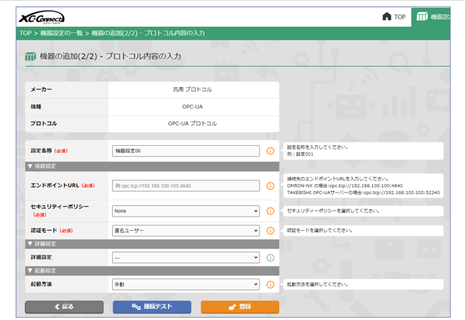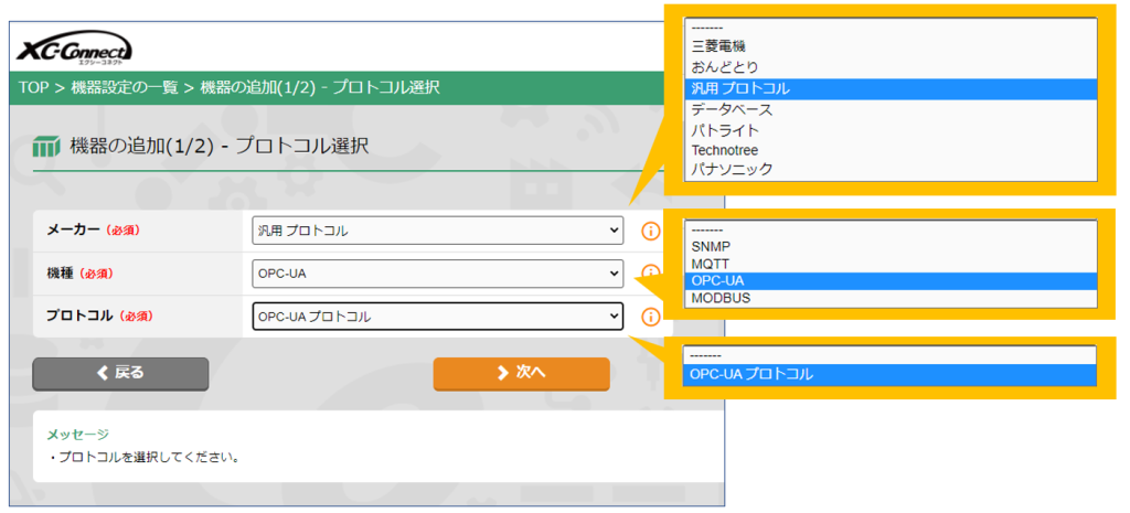 XC-Connectでデータの取得先を決める機器設定を開き、プロトコル選択画面で「汎用プロトコル」→「OPC-UA」の順に選択して次の画面に移ると…