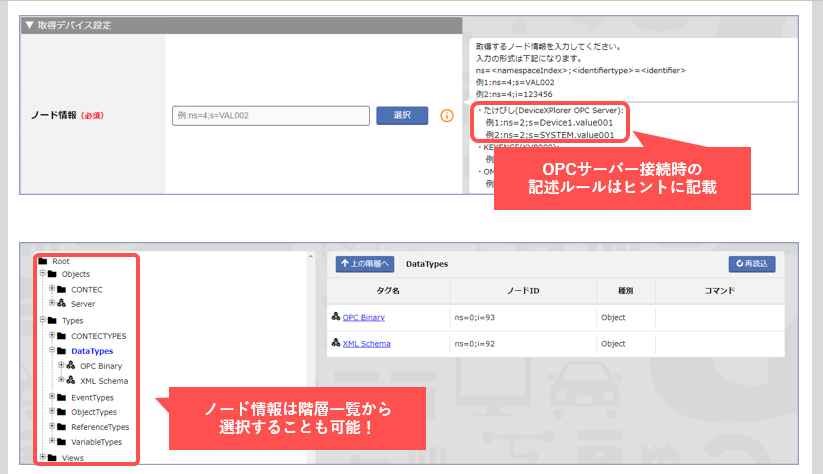 OPCサーバーとXC-Connectの連携では、どの情報を記載すればいいかが常に画面上で表示され、設定も比較的容易にできるようになっています。