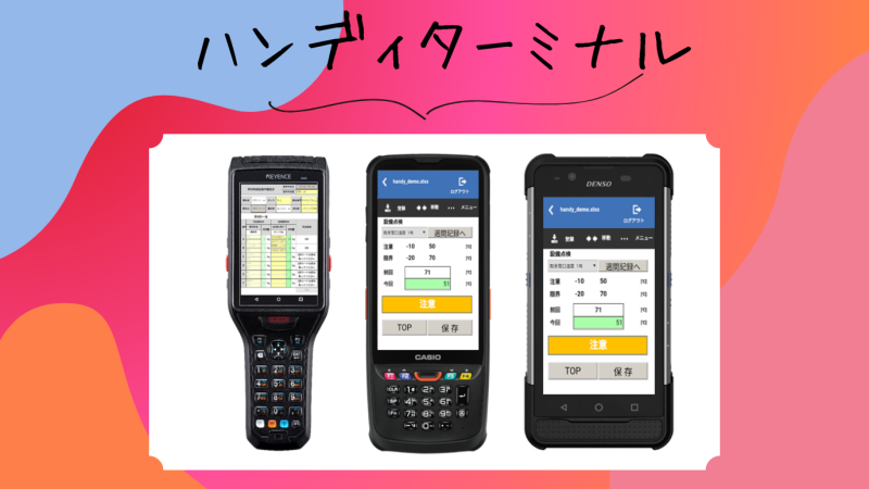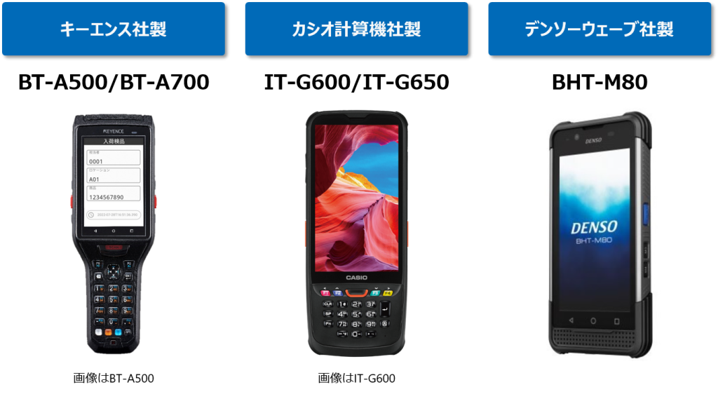 株式会社キーエンスが製造・販売するハンディターミナル(BT-A500/BT-A700)、株式会社デンソーウェーブのハンディターミナル(BHT-M80)での入力確認を行っております。