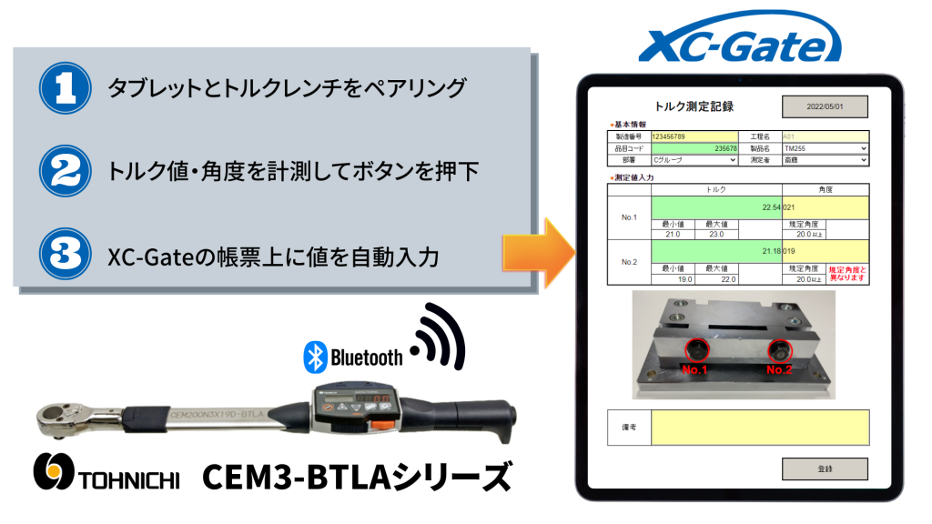 今回の連携によりCEM3-BTLAシリーズで測定した締め付け値(トルク)、角度を自動でXC-Gateの帳票上に取得することが可能となりました。今後はこの連携を通じ、計測記録作業の効率化、品質の均一化に貢献いたします。