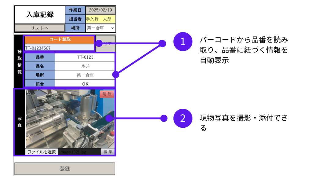 その他、バーコードを読み取ると、品番、品名、場所など読取内容に紐づく情報を自動で表示することも可能です。