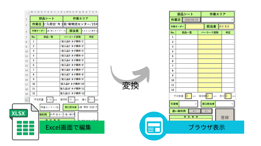 XC-Gateを利用することで、ハンディターミナル用のアプリやシステムの開発は一切不要で利用いただけます。入出庫や照合作業、チェックシート、作業報告など、ハンディターミナルで使いたい帳票画面を使い慣れたExcelのみで作成、つまりノーコードで現場でご活用いただけます。