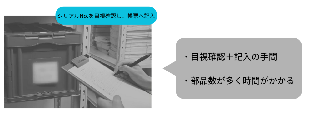 目視によるシリアルナンバーの確認では、番号の目視確認、帳票への記入など細かい作業が多く、ミスなく業務を進めていくことは非常に困難です。