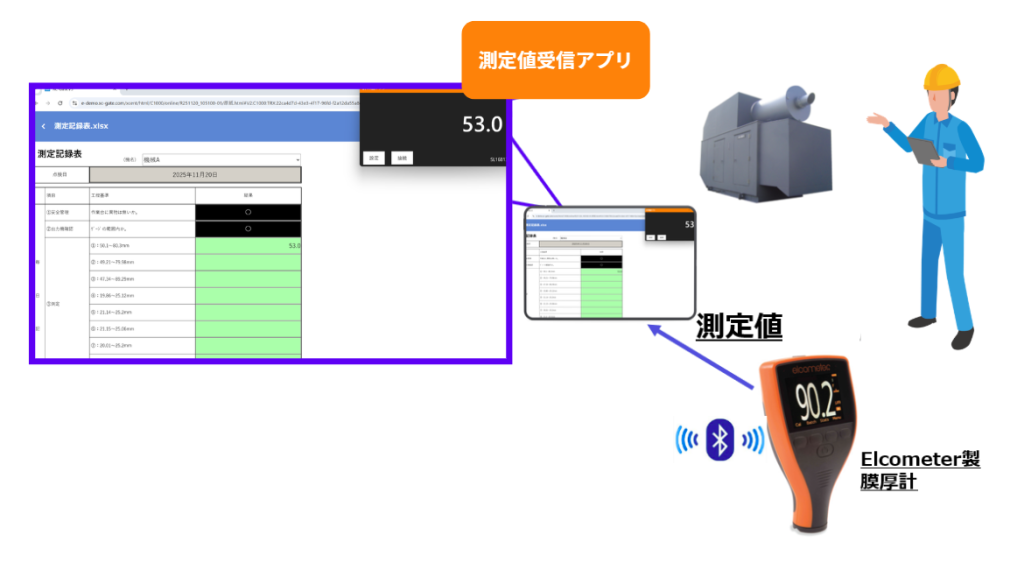 こうした現場の声に応えるべく、明電システムソリューション株式会社が提供する「計測器キーボードアプリ」と、現場帳票電子化ソリューション「XC-Gate」を連携させることで、膜厚計で計測したデータをそのまま帳票へ自動入力できる仕組みが実現しました。
