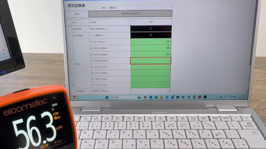 たとえば、塗装やめっき工程で使用する、塗装、めっき、コーティングなどの膜の厚さを測定する膜厚計で測定した結果を、そのまま検査記録書の該当欄へ自動転記。手入力が不要になるため、記入ミスや入力漏れを防ぎ、作業時間を大幅に短縮できます。測定結果はその場で帳票に反映されるため、上長への報告やデータ共有もスピーディーに行えます。