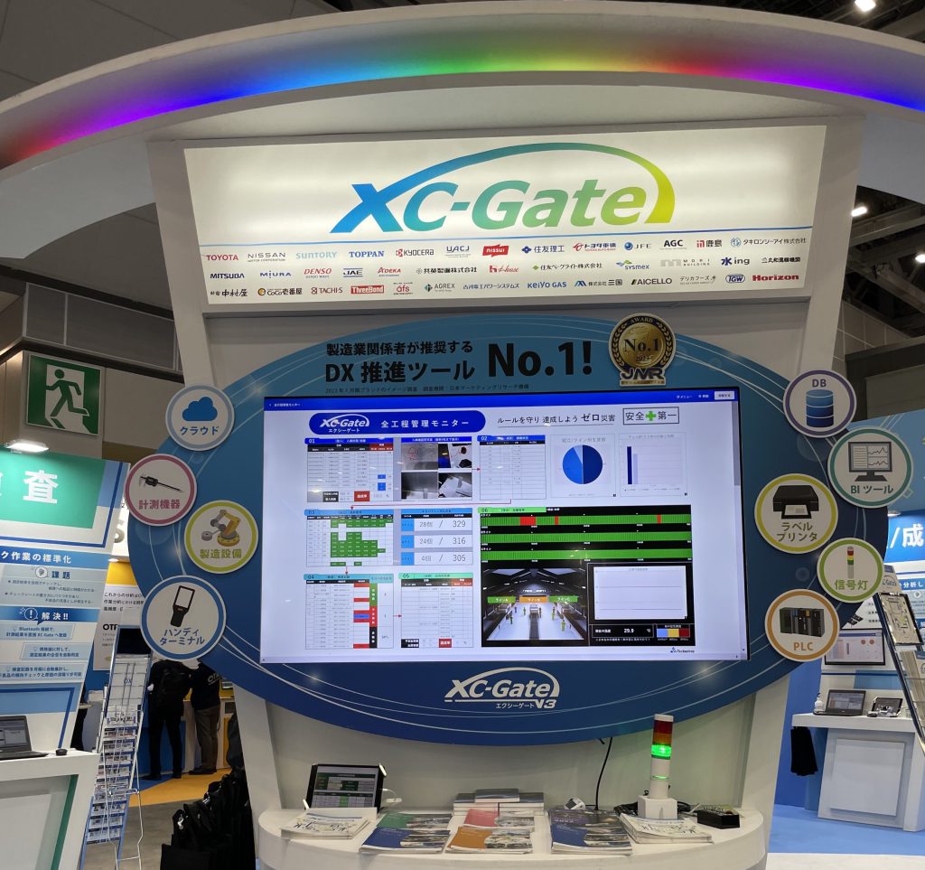 入口側には、上部が虹色に光っているアーチと前面の大型モニターに映された全工程管理モニターでお客様に「XC-Gate」をご紹介していました。