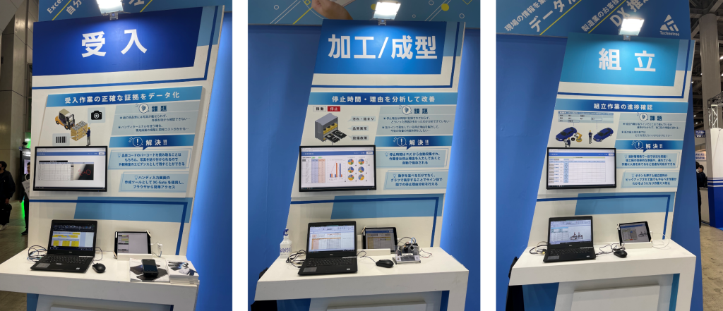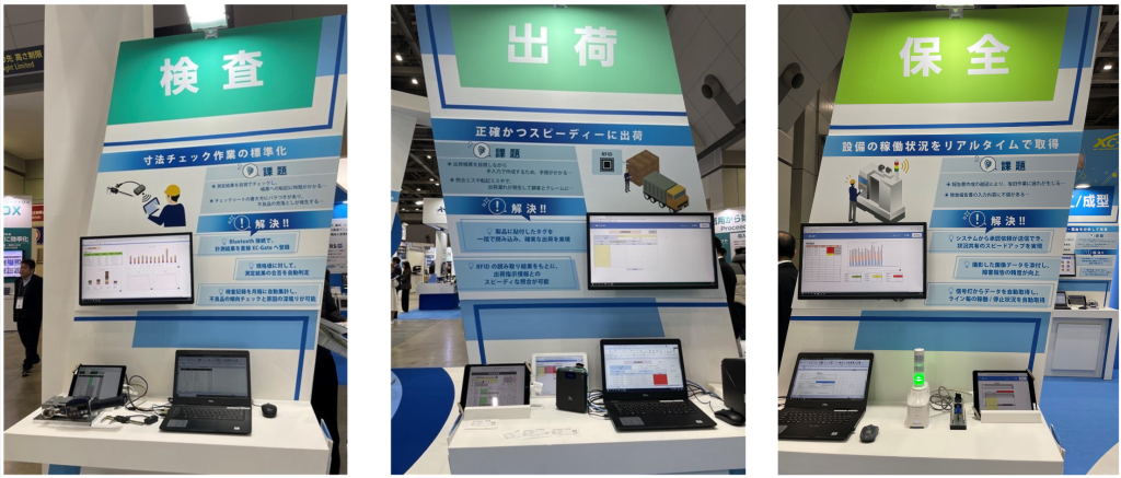 ブース内部には、製造工程での「XC-Gate」活用例をご紹介するコーナーを6コーナー設けており、現場帳票の電子化に加えて、各種機器との連携を実機を用いて展示を行っていました。