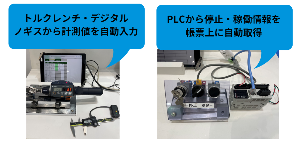 連携デモの一部をご紹介します。こちらは検査コーナーと加工/成型コーナーに置いていた計測機器連携とPLC連携です。製品が規定値以内のサイズかどうか、デジタルノギスで計測した値が連続して入力されていき、自動で規定値と比較してOK・NGを判定するデモは、イメージしやすく好評でした。PLCの情報は、デモでは停止・稼働情報を取得してチョコ停・ドカ停の要因記録に使っており、チョコ停の要因分析をデータ活用できることをお伝えしておりました。PLCが持っている情報は、お客様の設備にもよりますが他にも生産数・稼働時間・エラー情報など多岐にわたりますので、それらの情報を電子帳票上に取得して入力作業を効率化できることもご案内いたしました。
