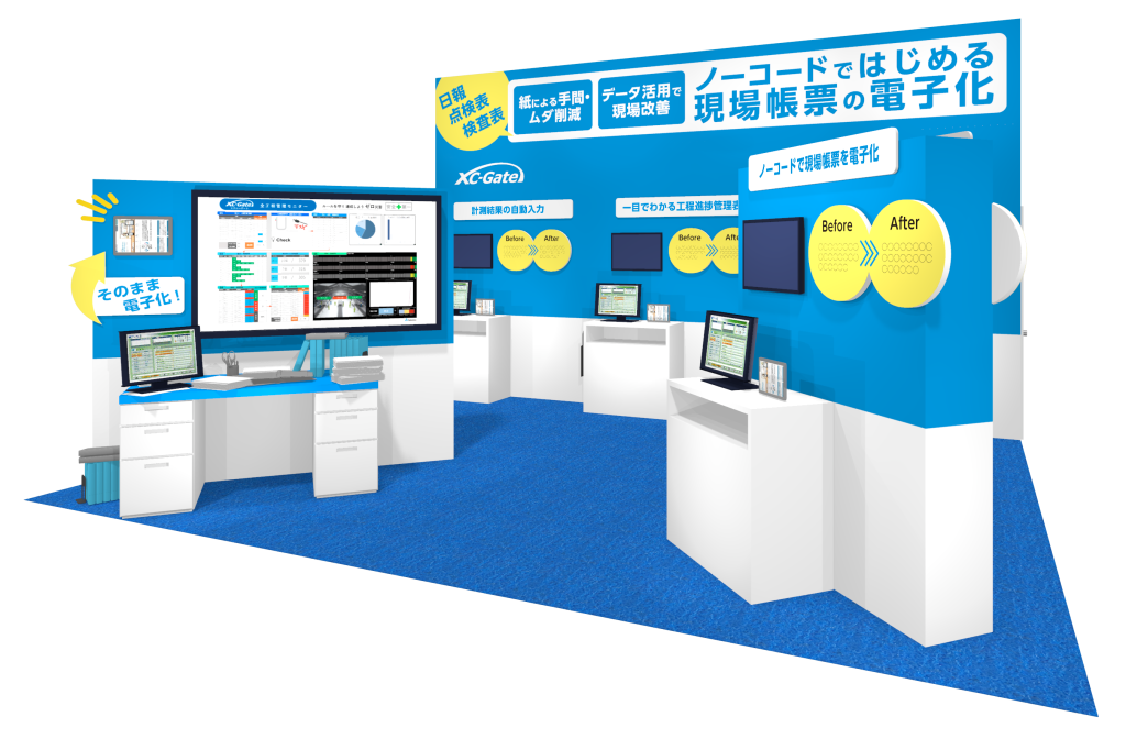 現場の日報や点検表などの紙帳票の電子化を検討されている方はもちろん、XC-Gateの利用をスタートされたユーザー様にも有益な情報をご提供できるようなブースとなっておりますので、皆様お誘いあわせの上ご来場いただけますと幸いです。