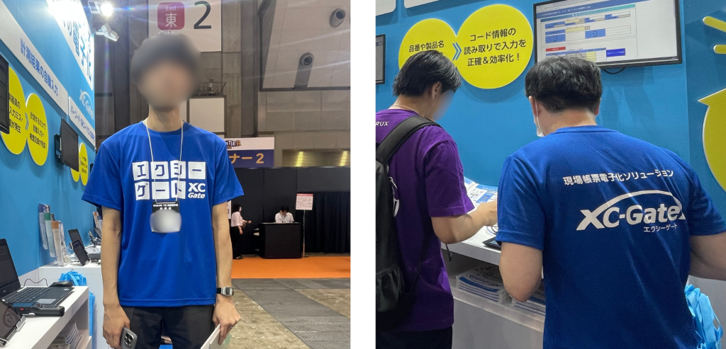新しい取り組みとして、今回の展示会では説明員がXC-GateTシャツを着用し展示説明にあたりました。背中にはXC-Gateのロゴ、そして前面にはカタカナで「エクシーゲート」をあしらったデザインとなりました。