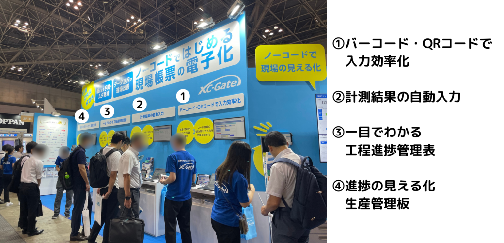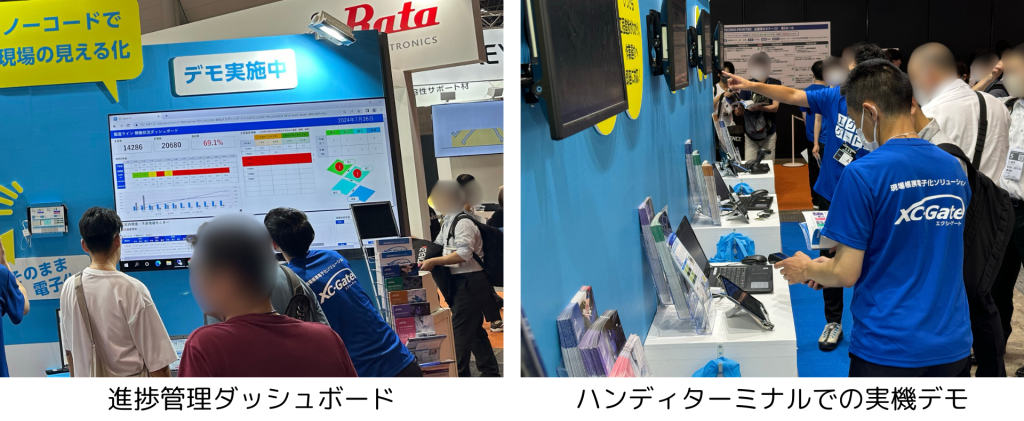 また、大通りに面した壁面には生産実績や工程進捗、不良の発生状況などをまとめてリアルタイムに確認できるダッシュボード画面(上図の左側)も展示しました。来場者された方からも、ダッシュボードを見た後にXC-Gateが帳票電子化システムだというのを知り「一つの製品でここまでできるの?」という嬉しいお言葉をいただきました。ブースで皆様のお話を聞き、アナログの記録管理に対する課題感や、入力データの活用に対するニーズの高さを改めて実感しました。