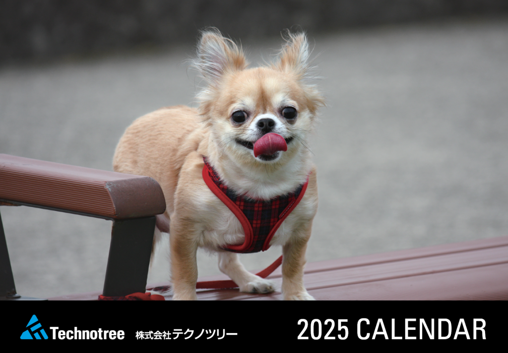 2025年度テクノツリーカレンダーの表紙は可愛らしいチワワのチョコちゃんです。舌をちょこんと出したチョコちゃんの写真は愛らしさ満点ですね!無邪気さが溢れる表情はまるで「遊ぼうよ!」もしくは「ちょっと休憩中だよ」とか言ってるようです。見ただけで微笑んでしまいますね。