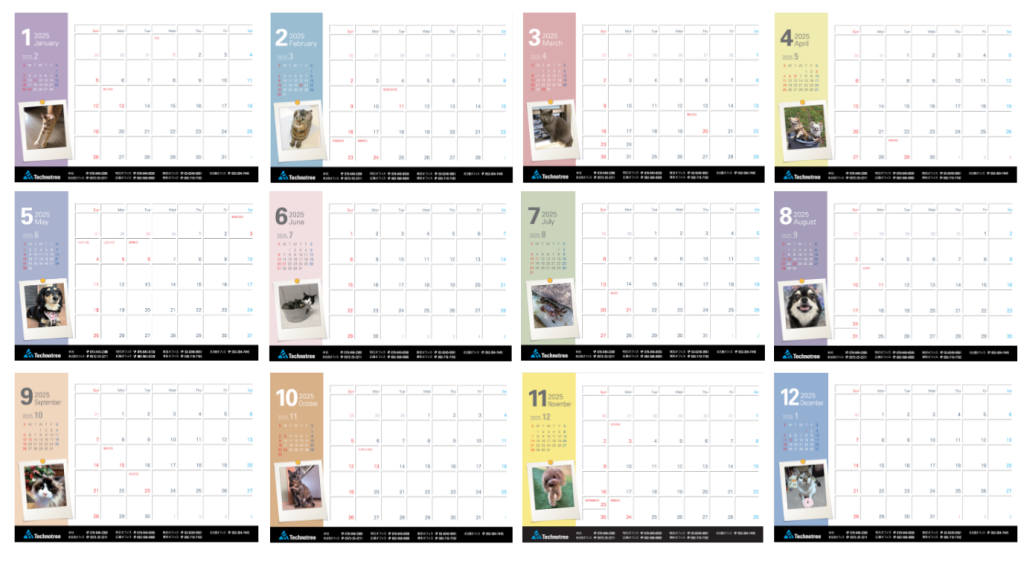 もしかすると、今この記事をご覧になっている方は既にご存知かもしれませんが、テクノツリー名物!テクノツリーペットカレンダー2025年版が完成いたしました!今年の2024年版は久々のペットカレンダーでしたが、来年度もかわいい動物がたくさんのカレンダーになりました。弊社カレンダーの隠れファンの方や、主役であるペットの飼い主こと弊社社員に向けて、本記事でカレンダーの中身をご紹介させていただきます。お仕事の合間の癒しになること間違いなしです!